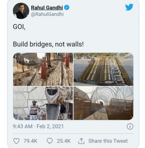 টুইটারে চারটি ছবি পোস্ট করলেন। তাতে দেখা যাচ্ছে, কীভাবে তারকাঁটা, পেরেক, ছড়িয়ে রয়েছে বিক্ষোভস্থলে। কীভাবে গাজিপুর–মেরঠ জাতীয় সড়কে ব্যারিকেড দেওয়া হয়েছে। যার জেরে উত্তরপ্রদেশ থেকে কৃষকরা আর ঢুকতে পারছেন না দিল্লি সীমান্তে বিক্ষোভস্থলে। এই ছবি দিয়ে রাহুল লিখলেন, ‘সেতু তৈরি করুন, দেওয়াল নয়। এদিন সকালে কৃষক বিক্ষোভ নিয়ে প্রধানমন্ত্রীকে খোঁচা দিয়েছেন কংগ্রেস নেত্রী প্রিয়াঙ্কাও লিখেছেন।