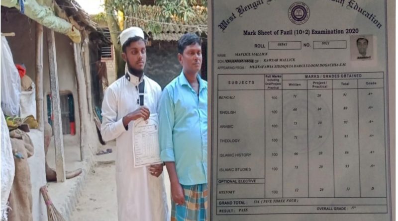 নতুন গতি ওয়েব ডেস্কঃ আলিয়া বিশ্ববিদ্যালয়ের স্নাতক প্রথম বর্ষের ছাত্র মফিজুল মল্লিক ফাজিল পরীক্ষায় ভালো ফল করেও আর্থিক অনটনের কারণে পড়াশুনার খরচ নিয়ে চিন্তিত। কেশপুর ব্লকে দোগাছিয়া গ্রামে বাড়ি মফিজুল মল্লিকের । বাবা কৌসর মল্লিক একজন দিনমজুর। দিন আনে দিন খায়। বাড়ির আর্থিক অবস্থাও খুবই খারাপ। জমি জায়গা নাই। মফিজুল মল্লিক উচ্চমাধ্যমিক (ফাজিল ) পরীক্ষায় ৫২৯ পেয়েছিল। পরে পিপিআর করায় প্রাপ্ত নম্বর বেড়ে দাঁড়ায় ৫৩৪। সে দোগাছিয়া সিনিয়ার এম এস ডি ইউ মাদ্রাসা থেকে উচ্চমাধ্যমিক ( ফাজিল ) পরীক্ষা দিয়েছিল।