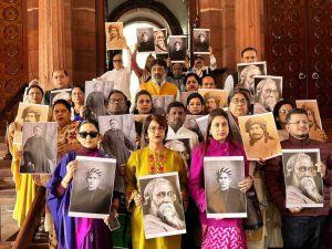 এই পরিস্থিতিতে আজ সকালে দিল্লির সংসদের সেন্ট্রাল হলে নীরব প্রতিবাদে শামিল হন তৃণমূল সাংসদরা। তাঁদের হাতে ছিল বাংলার মনীষীদের প্রতিকৃতি-বঙ্কিমচন্দ্র চট্টোপাধ্যায়, রবীন্দ্রনাথ ঠাকুর, বিদ্যাসাগর, রামমোহন রায়-সহ অন্যান্যদের ছবি। কোনও স্লোগান নয়, নিঃশব্দে মনীষীদের ছবি তুলে ধরেই তাঁদের প্রতীকী প্রতিবাদ।সাংসদদের বক্তব্য,এটি বাংলার আত্মসম্মান রক্ষার লড়াই। যারা আমাদের মনীষীদের অবমাননা করেন, তাঁদের বিরুদ্ধে প্রতিবাদ জানানোই আমাদের দায়িত্ব। তৃণমূলের দাবি, রাজনৈতিক স্বার্থে বিজেপি বাংলার সংস্কৃতি ও ঐতিহ্যকে আক্রমণ করছে, যা দেশের সাংবিধানিক মূল্যবোধ ও বহুত্ববাদের পরিপন্থী। সংসদ চত্বরে তৃণমূল সাংসদদের নীরব প্রতিবাদ।